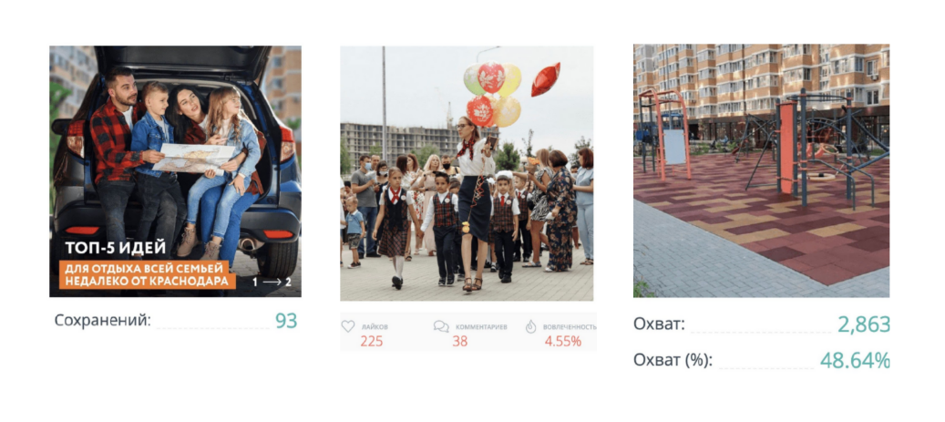 Благодаря упору на живой контент (отзывы жителей, конкурсы с упоминаниями, рекламные интеграции с блогерами, Reels о преимуществах ЖК, румтуры по квартирам) нам удалось увеличить увеличить средние охваты аккаунта СК "Семья" в Instagram на 13%, количество упоминаний - в 2,3 раза, количество обращений - в 1,5 раз.